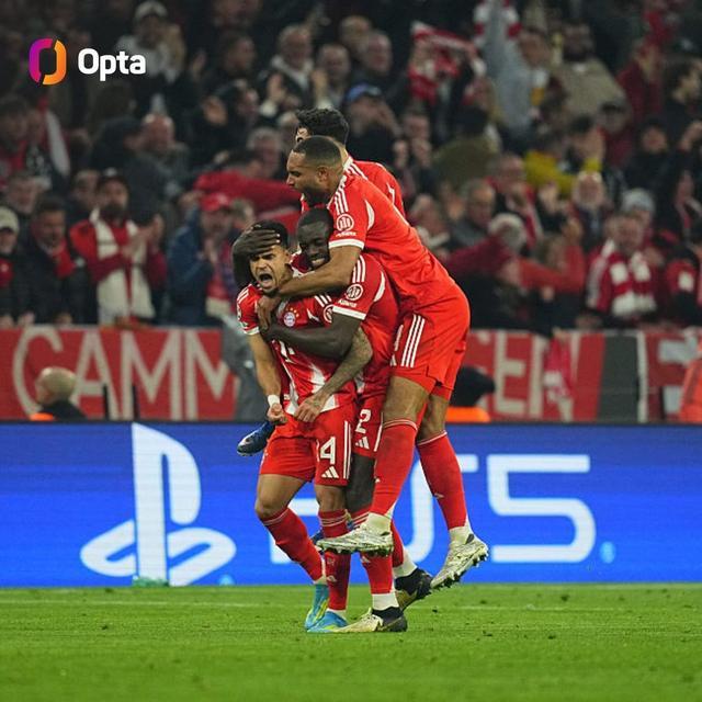 欧冠1/4决赛次回合,拜仁慕尼黑主场4-3逆转击败皇家马德里,成为欧冠淘汰赛历史上第二支至少三次落后仍最终赢球的球队。